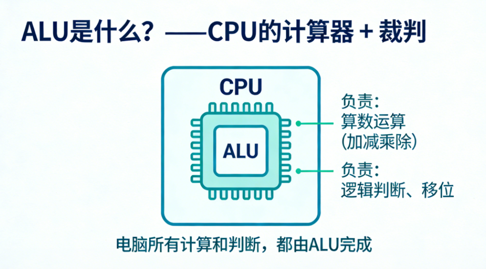 ALU 是 CPU 的计算器 + 裁判,由 12 个干具体小事的简单零件拼成,能做所有算数运算(本质都是加法)和逻辑判断 / 移位,电脑的所有计算和基础判断,都是这个小模块干的。