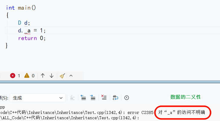 二义性:当你在 D 中访问 A 的成员时,编译器不知道该用 B 分支的还是 C 分支的,直接编译报错。