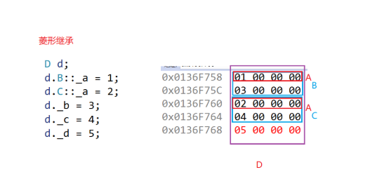 同时,因为只有一份 A,访问时也就不存在二义性了。需要注意的是,虚基类 A 是由最底层的 D 来直接初始化的,而不是由 B 或 C 初始化。