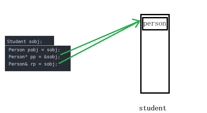 指针 / 引用切片:基类指针(引用)直接指向(绑定)到派生类对象中属于基类的那部分内存,并非新建对象,只是只能访问基类成员。