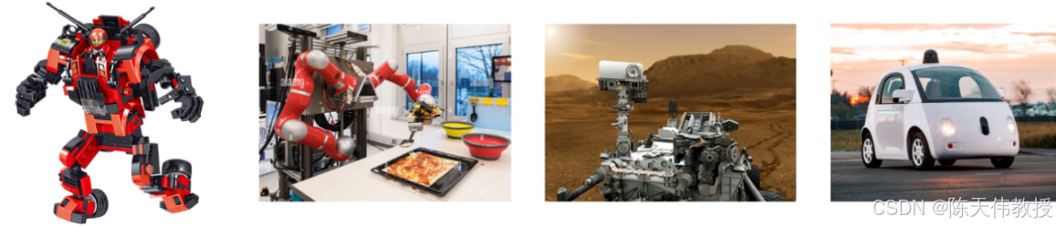 图展示了四种典型的机器人形态:玩具机器人、厨师机器人、外星探索机器人和自动驾驶汽车。从它们的外形和用途可以看出,机器人并不局限于人形,其本质不在于"像人",而在于"像人那样完成任务"。