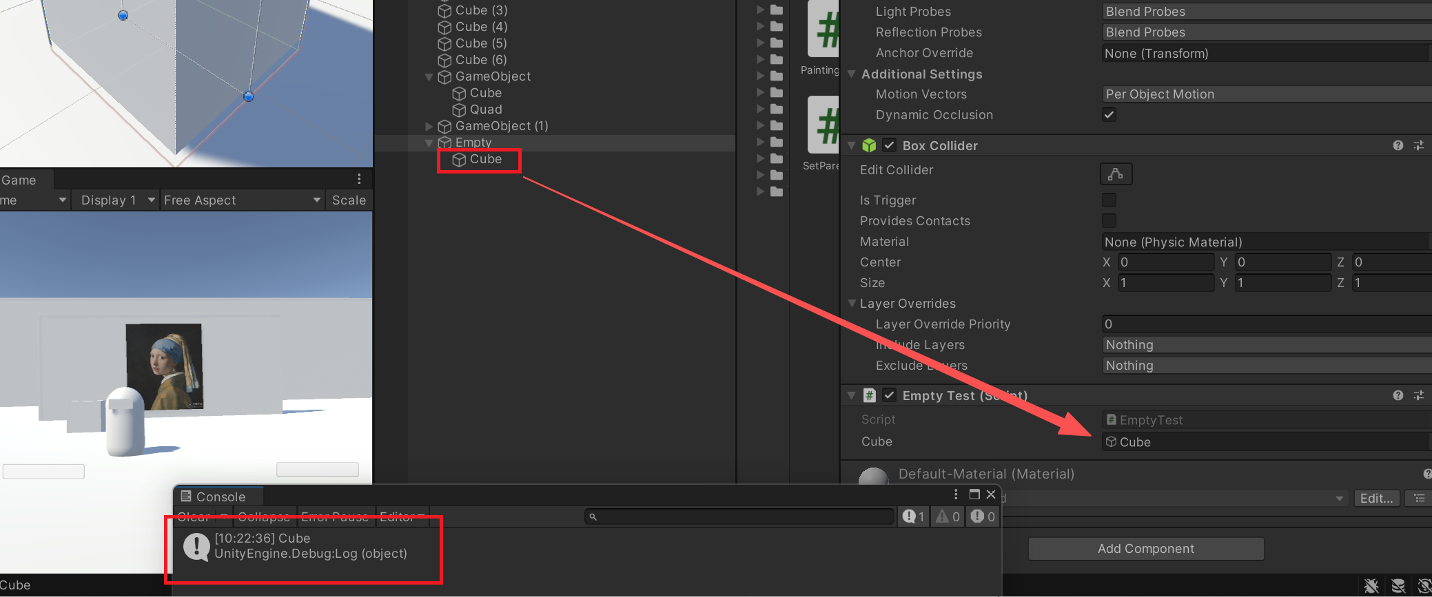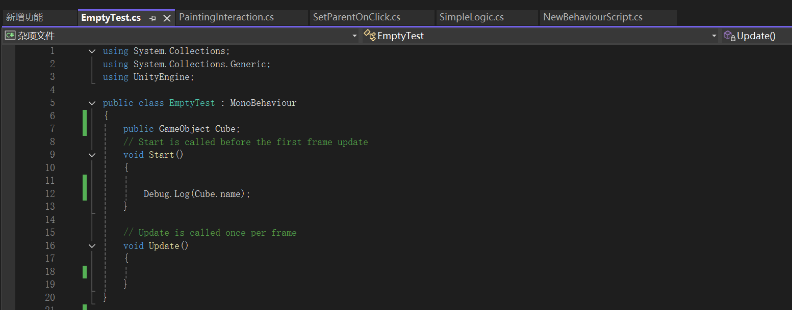 如下图,在Empty挂载的脚本定义Cube(名字任意),然后将场景内的游戏物体Cube拖入该变量完成引用。