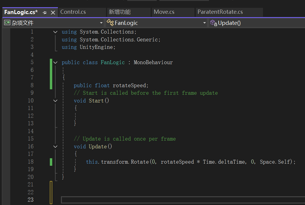 在风扇物体FanLogic组件中定义了转速rotateSpeed,但并未设置值。
