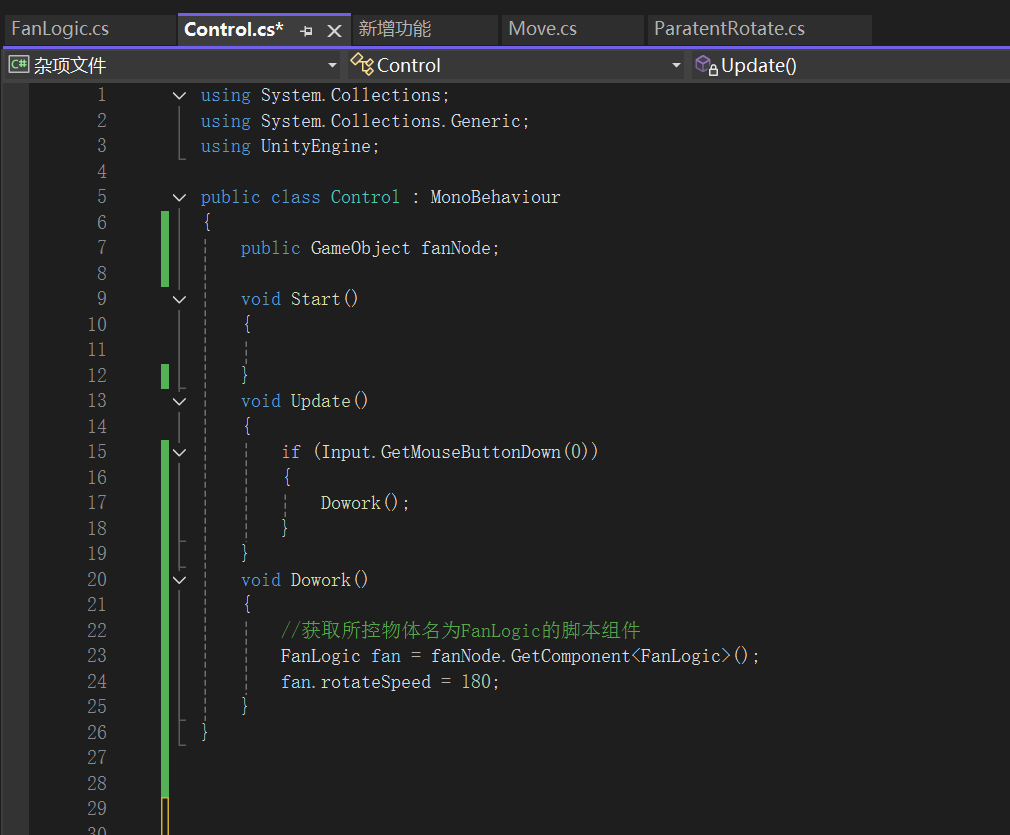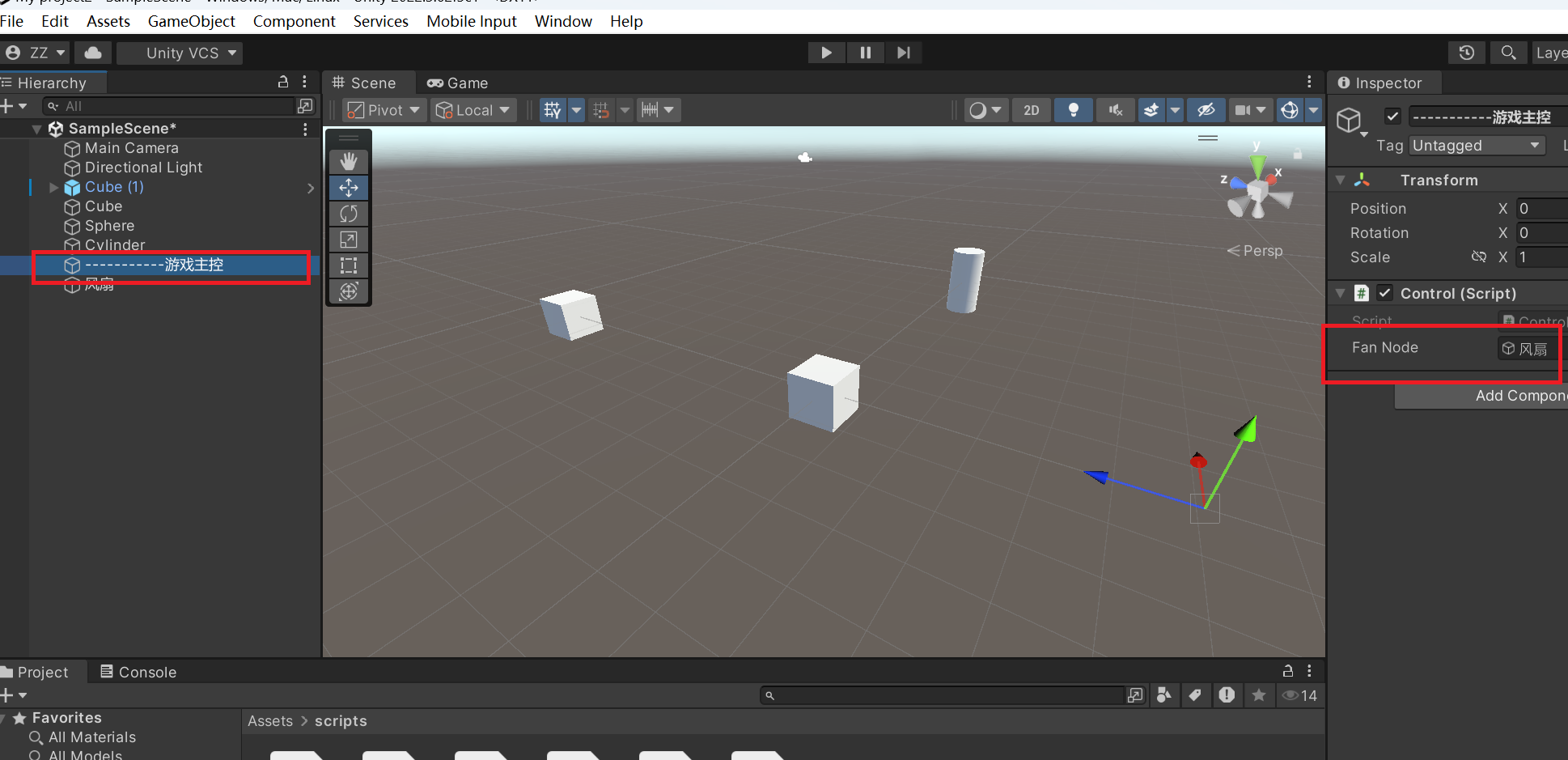 想实现通过点击Game游戏界面控制风扇(图中Cube代替)的转动。