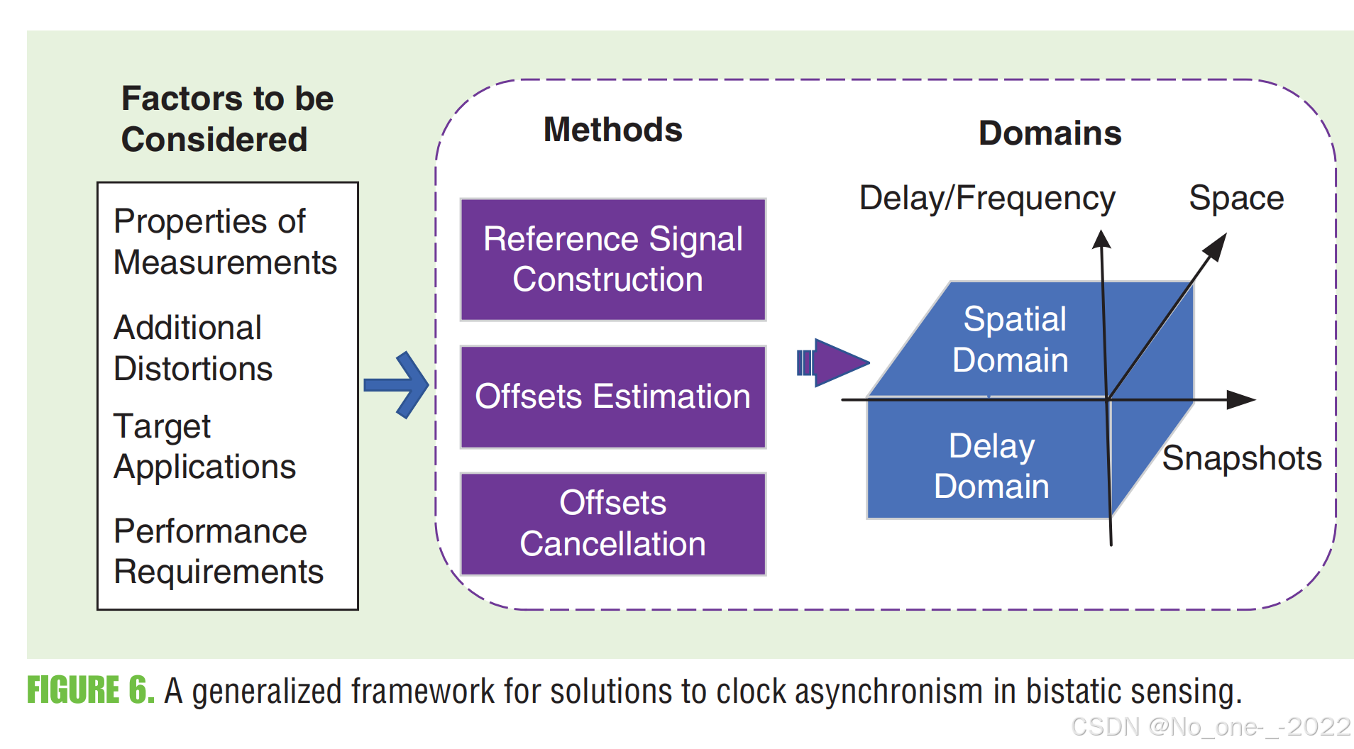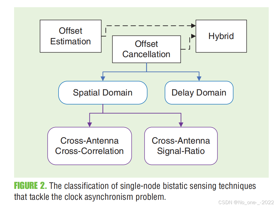 从信号处理的角度来看,可以通过消除(2)式中 ξ i , k \xi_{i,k} ξi,k 的贡献来解决双基感知中的时钟异步问题。这种消除可以通过在不估计具体数值的情况下进行抵消来实现,也可以通过估计随后进行补偿来实现;它还可以在不同的域中完成,例如空域和时延域。根据"消除"是如何实现的,我们将文献中发现的技术组织并展示为三种主要类型的方法,如图 2 所总结的那样。