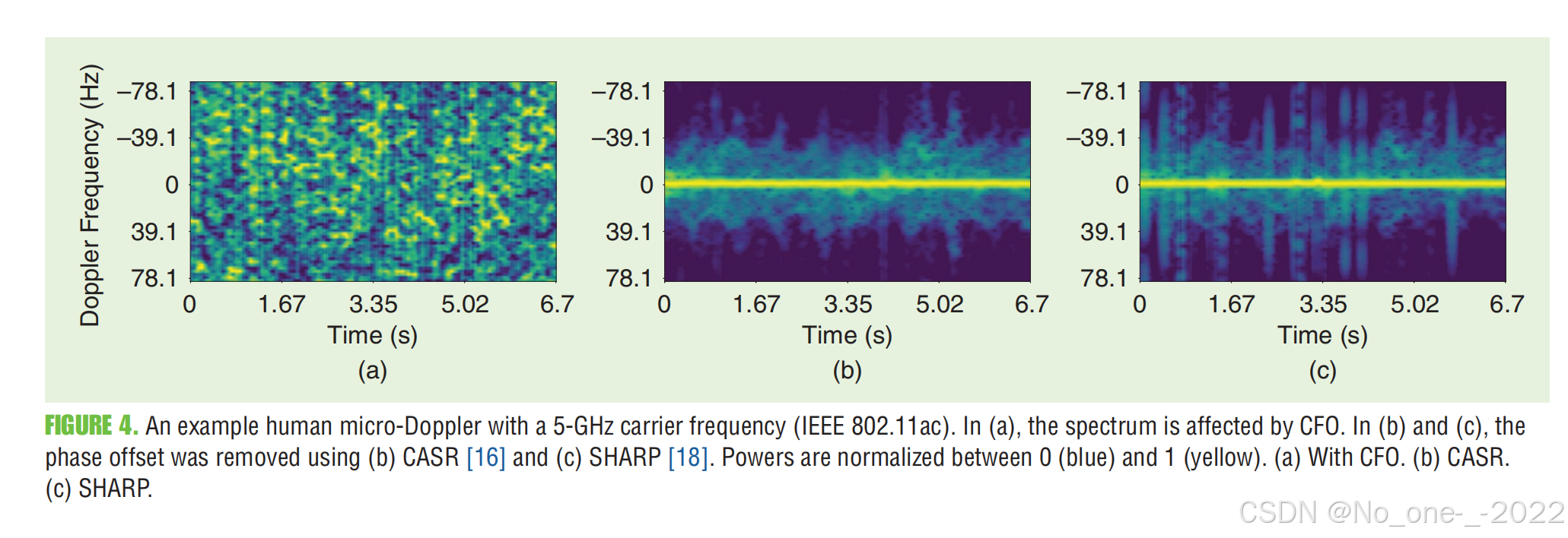 注意, CSI 的功率可以被用来在时域内联合处理多个测量结果。此外,雷达感知中流行的先进感知技术,例如微多普勒频谱图 [8] ,也受到 CFO 的严重影响, CFO 会破坏多普勒特征。微多普勒包含关于目标的细粒度信息,包括多个移动部分。它是许多应用的关键组成部分,例如目标识别、人类活动识别和人员身份验证等 [2] 。我们将使用微多普勒的质量作为可能的评估标准之一,以及作为比较各种 CFO 消除方法的一种手段。