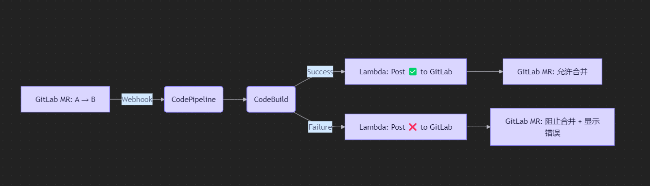 AWS CodePipeline/CodeBuild 本身不会自动回写状态到 GitLab ,但你可以通过 Lambda + GitLab API 在构建失败时 设置 MR 状态为 ❌ 并阻止合并。