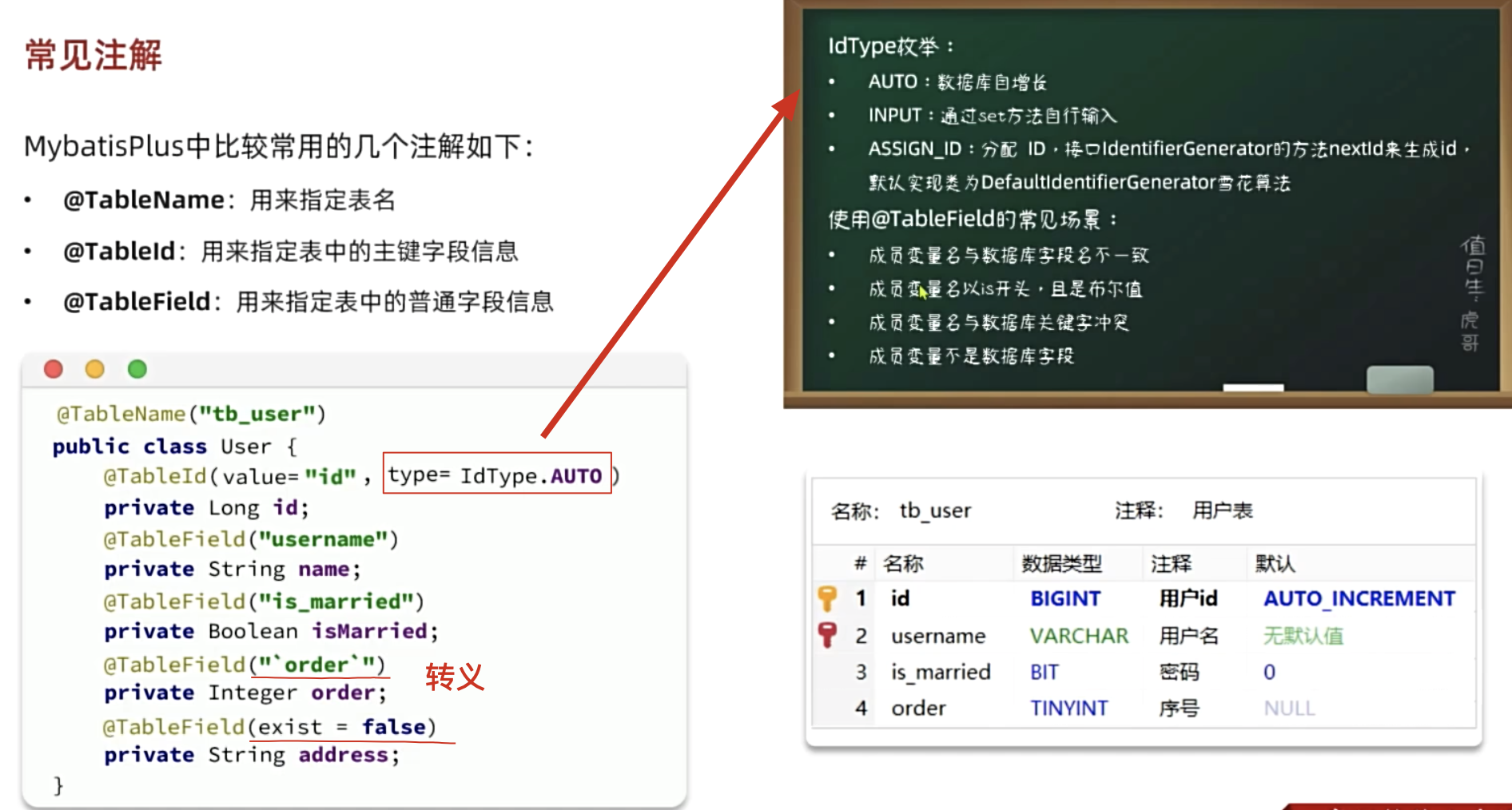 @TableName:用来指定表名@TableId:用来指定表中的主键字段信息@TableField:用来指定表中的普通字段信息