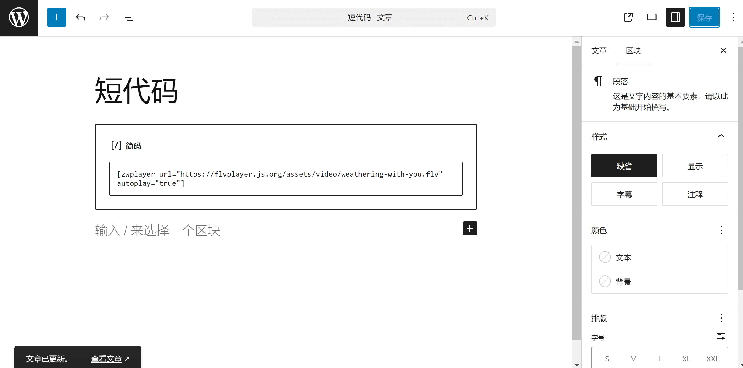在文章编辑器中搜索"ZWPlayer",插入区块后,右侧属性栏提供了可视化的配置项: