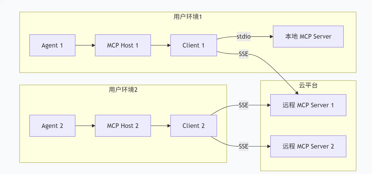 * **远程网络通信 (SSE/HTTP)**:当服务器作为独立服务远程部署时,客户端通过Server-Sent Events或HTTP流与其交互。