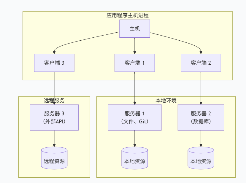 * **多Server聚合模式**:这正是**主机创建多个客户端**,每个客户端连接一个服务器的标准用法。主机负责聚合所有服务器的能力。
