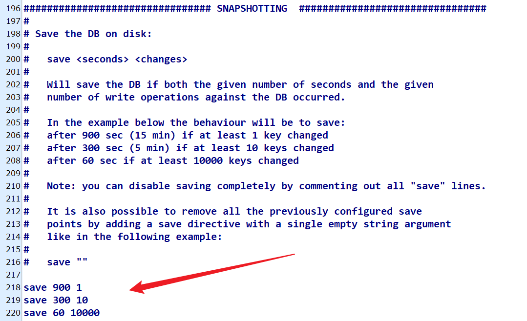save 900 1:900 秒(15 分钟)内至少 1 个键被修改,触发快照