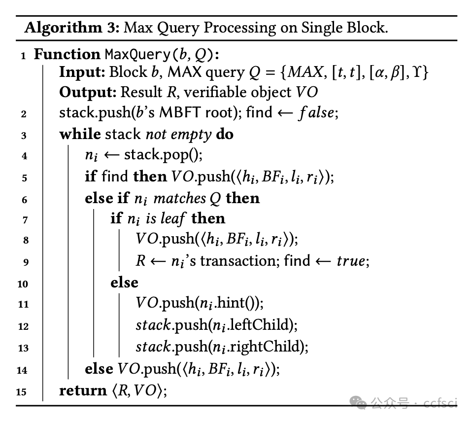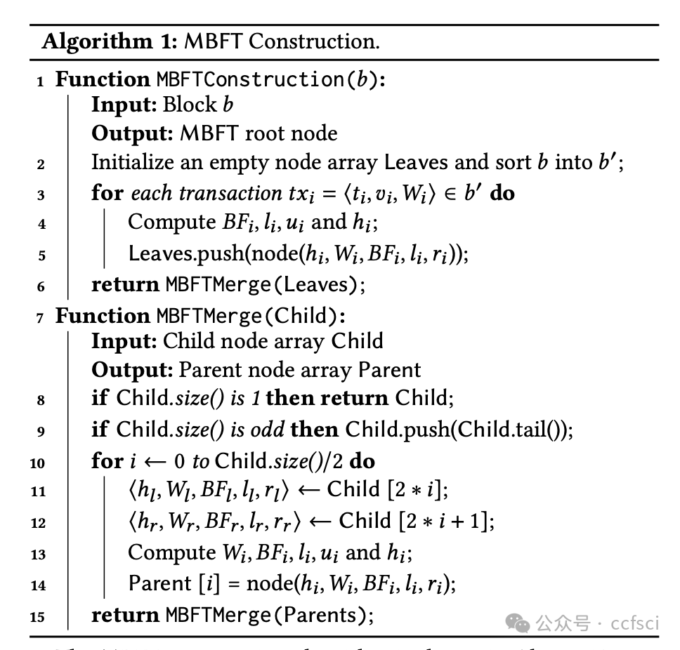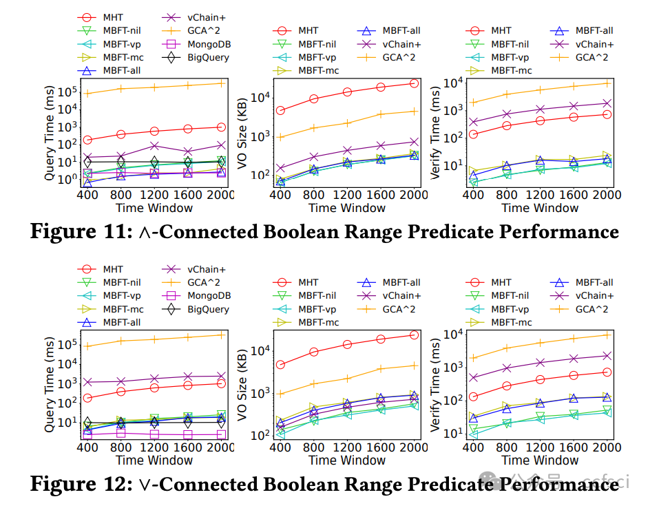 区块链因其安全性而被广泛应用,用于数据安全处理。随着区块链数据量的增长,对高效数据分析(尤其是聚合查询)的需求日益迫切。然而,当前的区块链缺乏对高效分析查询处理的原生支持,迫使用户要么维护完整副本,要么依赖缺乏完整性保证的第三方服务。本文提出了一种高效的框架------默克尔布隆过滤器树(MBFT),用于在区块链上进行结合布尔关键字和范围谓词的认证聚合查询。其核心是一个基于布隆过滤器的认证数据结构,支持两种类型的谓词,并针对每个区块构建,以实现高效的交易索引。对于时间谓词,我们通过值剪枝和区块合并来优化时间窗口查询。我们设计了一种新颖的合并布隆过滤器(MBF),用于在查询认证过程中高效处理动态集合。我们对布隆过滤器误报率造成的存储开销进行了理论分析。我们的框架采用数据草图来支持各种聚合操作。大量实验表明,与最先进的认证查询解决方案相比,MBFT 将查询速度提高了 286 倍。
