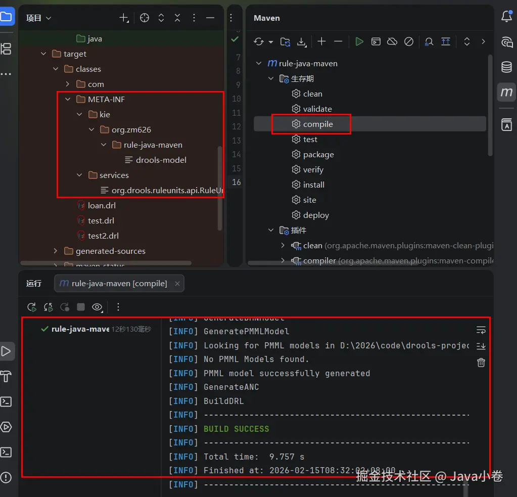 现在咱姑且先检查下原先定义的drl文件,有中文的地方都换掉。 kie-maven-plugin插件会在运行mvn compile时发挥作用,会检查drl语法确保编译出来的规则包能用,且可以生成<packaging>指定的满足kjar的META-INFO结构,以便规则运行阶段基于这些信息更高效的加载规则。 那么咱们看下操作: