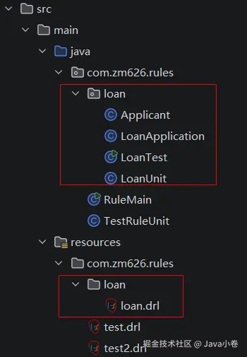 还是以KIE Drools 10.x 规则引擎快速入门#构建贷款申请rule示例这个例子为例,我们用ruleunit形式来改写下。最终完成的程序文件结构如下: