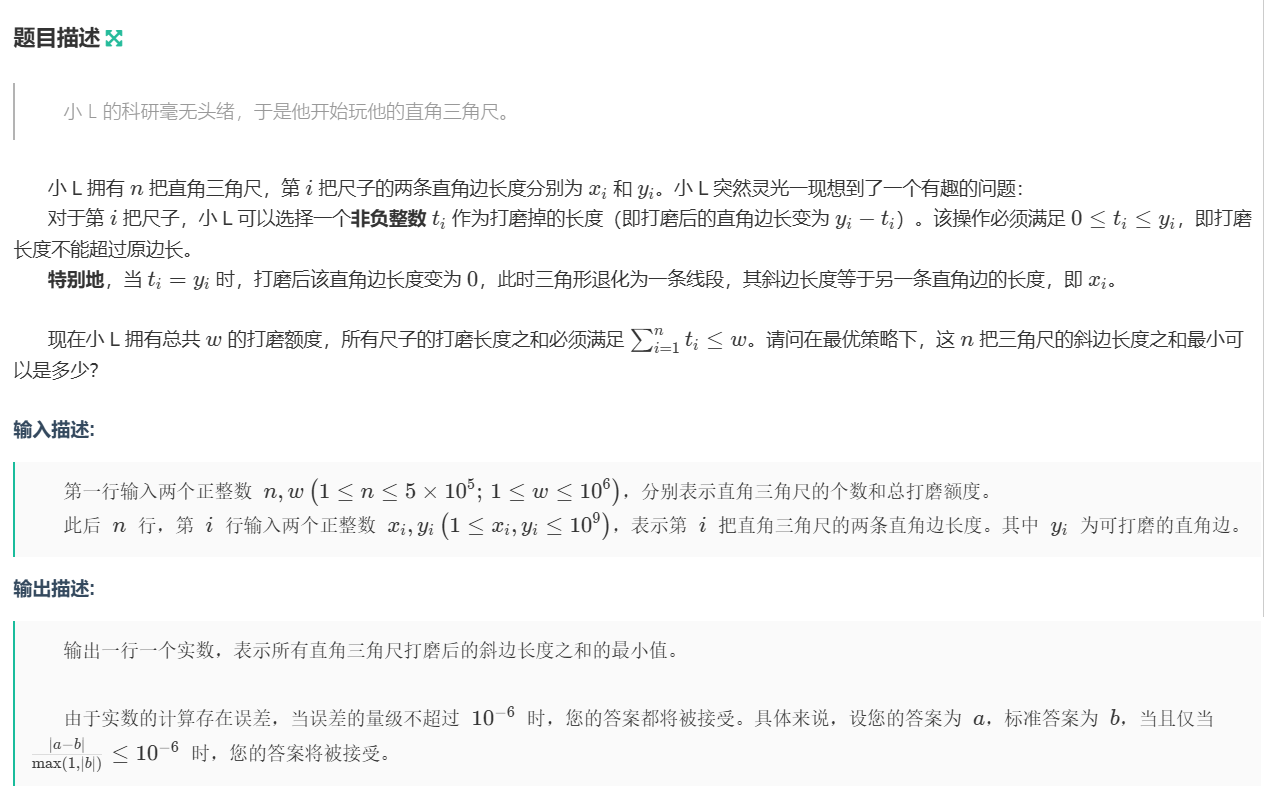 给定n个三角尺和w的打磨额度,打磨额度可以用在打磨这些三角尺的一条直角边,但是单次打磨必须是整数。问最后将打磨额度用光或者将全部三角尺打磨成直线之后,这n把三角尺的斜边长度之和最小是多少