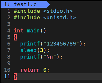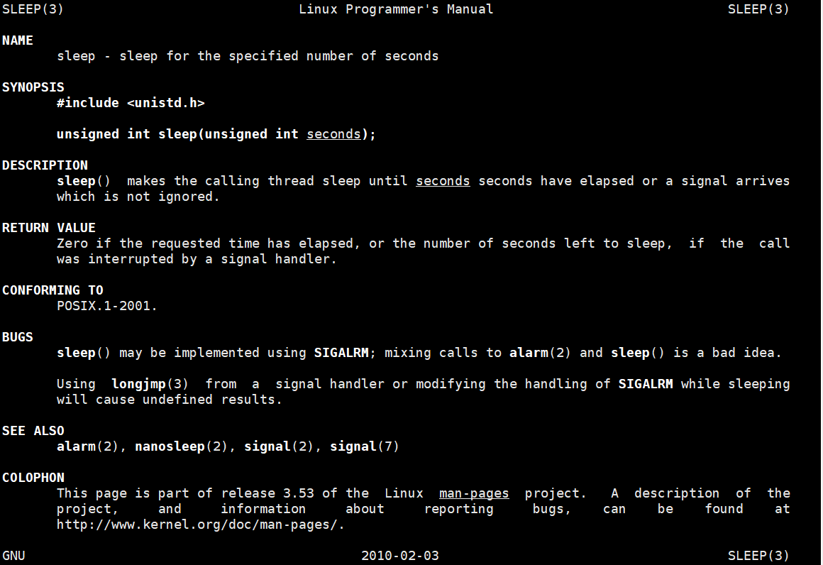 在上面代码中,sleep(3)函数的意思是,代码运行到这里时,休眠三秒,然后再往下运行,使用这个函数需要包含头文件unistd.h,具体介绍可以通过man 3 sleep进行查询。