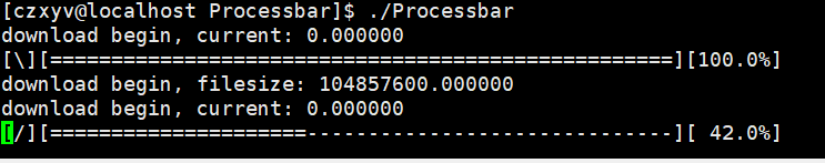 printf("[%c][%-20s][%5.1lf%%]\r", lable[cnt % len], bar + 1, rate); // 打印进度条