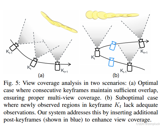 关键帧后插入:第一个细化阶段识别视野覆盖不足的区域,特别是靠近视锥边界的区域。如图5所示,这些区域通常出现在相机向前运动之后的向后旋转运动中。在在线处理过程中,关键帧的选择依赖于相邻帧之间的平均光流,因为如果没有未来的轨迹信息,则无法完全评估视图覆盖率。为了识别离线阶段未被观察到的区域,我们将每个关键帧的像素投影到相邻的关键帧上,并量化落在相邻关键帧视野之外的像素的百分比。当这个百分比超过预定的阈值时,我们将该区域标记为观测不足。然后在这些位置插入额外的关键帧实现更完整的重建,保留场景边界的关键细节。