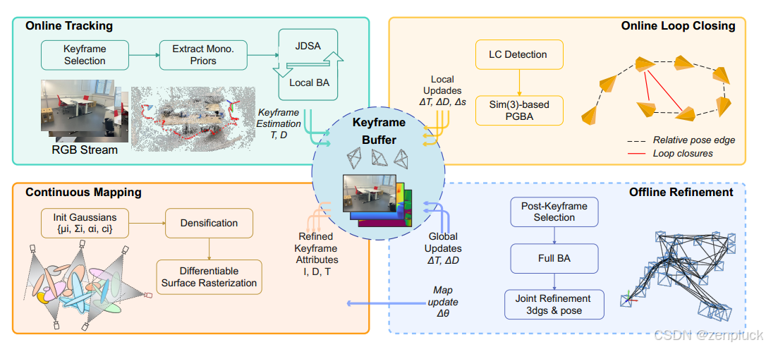 我们的系统旨在实现快速准确的摄像机跟踪和单目RGB输入的场景重建。如图所示,该系统包括四个关键组件:在线跟踪器、在线闭环模块、连续建图器和离线优化阶段。