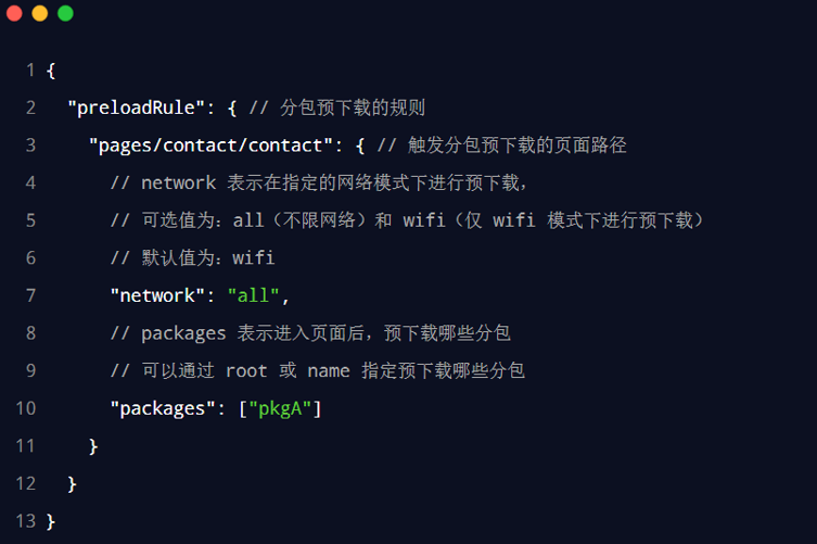 预下载分包的行为,会在进入指定的页面时触发。在 app.json 中,使用 preloadRule 节点定义分包的预下载规则,示例代码如下: