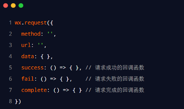 默认情况下,小程序官方提供的异步 API 都是基于回调函数实现的,例如,网络请求的 API 需要按照如下的方式调用: