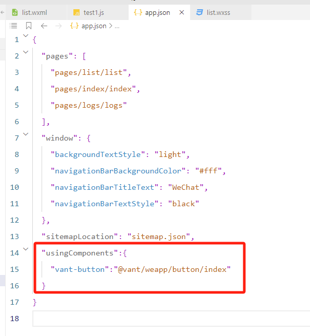 在 app.json 的 usingComponents 节点中引入需要的vant里的组件,就可在 wxml 中直接使用组件了。
