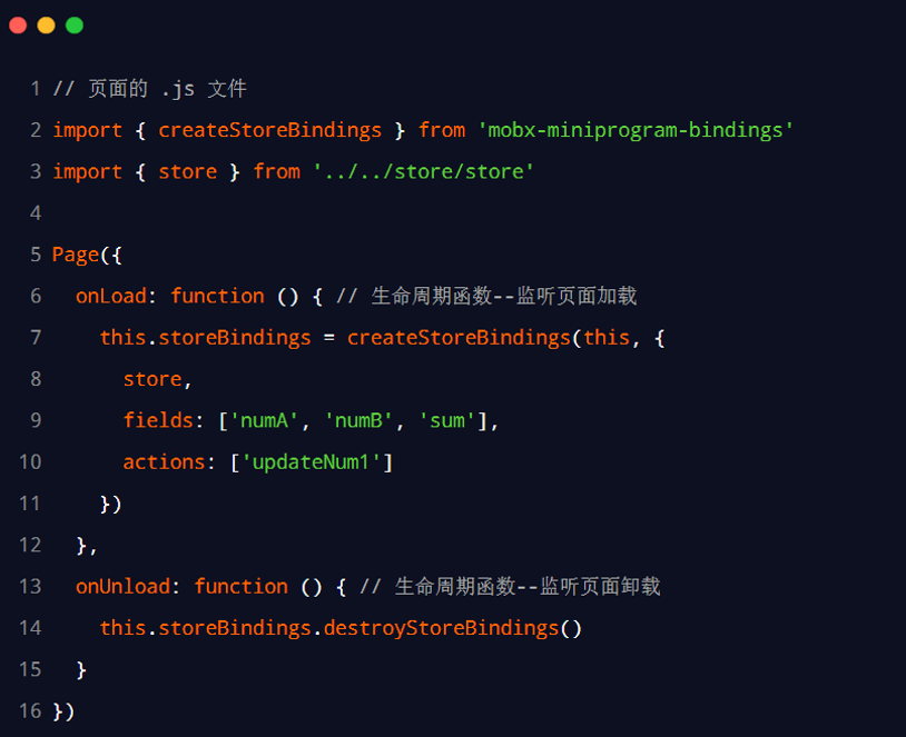 其中,createStoreBindings函数里,传递了两个参数,第一个是this,指的是当前页面的实例(将来需要把store里的数据绑定到当前页面里来使用)。第二个参数是一个page对象,对象里包含了三个属性,分别是store、fields、actions,其中