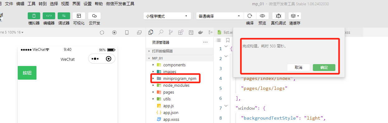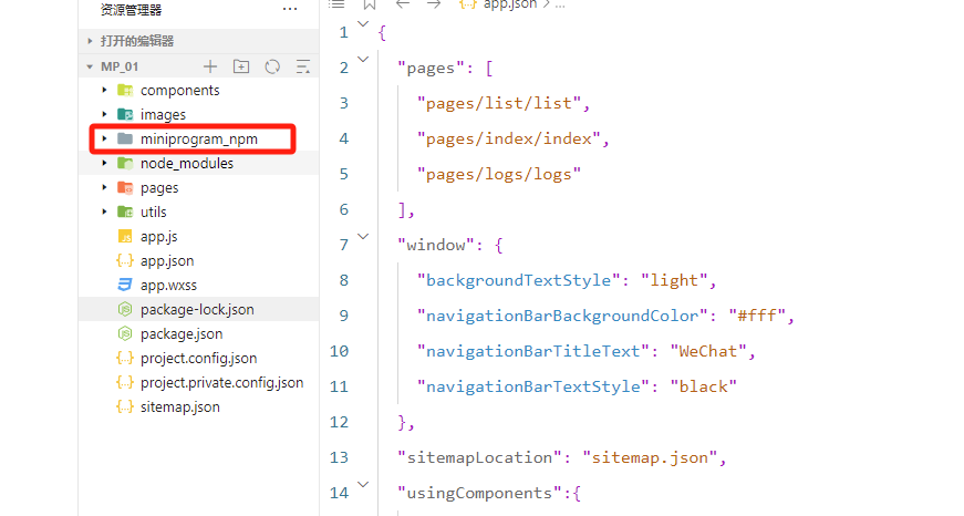 所以需要手动构建后才能使用(小程序安装完包后,都需要手动构建一下才能使用),为了避免不必要的错误,建议每次构建前,都把下边这个miniprogram_npm目录删除后,再构建