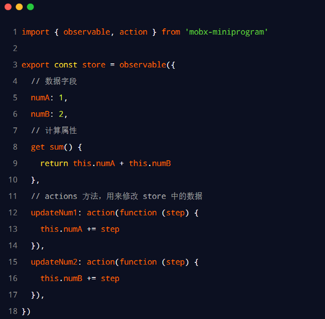 - mobx-miniprogram 用来创建 Store 实例对象