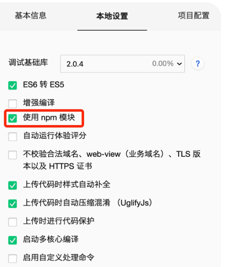 然后,找到 "详情"-"本地配置"-"使用npm模块",勾选即可(新版本的微信开发者工具已经默认支持npm了,找不到下边这个配置,其实已经不需要再手动配置修改这个选项了)