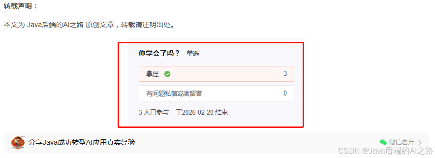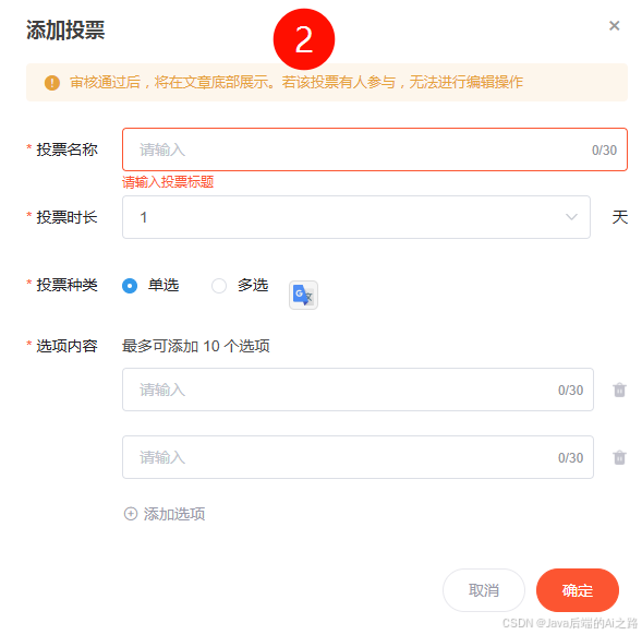 投票内容应该与文章的主题相关,这样才能吸引更多读者参与。比如,如果你发布的是一篇关于 Java 学习的文章,你可以设置一个关于 Java 知识点的投票问题。