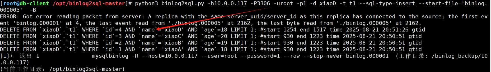 注意:可以指定开始和结束的日志信息然后写入到一个文件中,然后导入mysql中,进行备份的恢复。