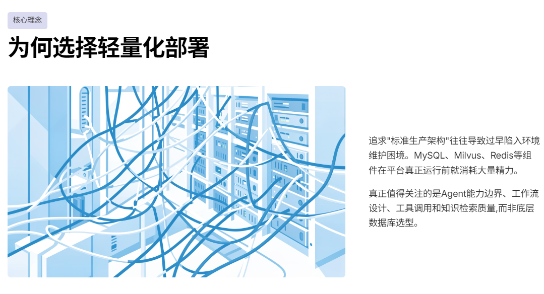MySQL、Milvus、Redis、对象存储、消息队列,一套下来,架构图很漂亮,组件也都"选对了",但问题是------平台还没真正跑起来,人已经开始疲于维护环境。很多时候,Agent 还没来得及认真设计,Workflow 还没来得及反复打磨,精力就已经被消耗在端口冲突、服务启动顺序、依赖版本不一致这些"非核心问题"上。