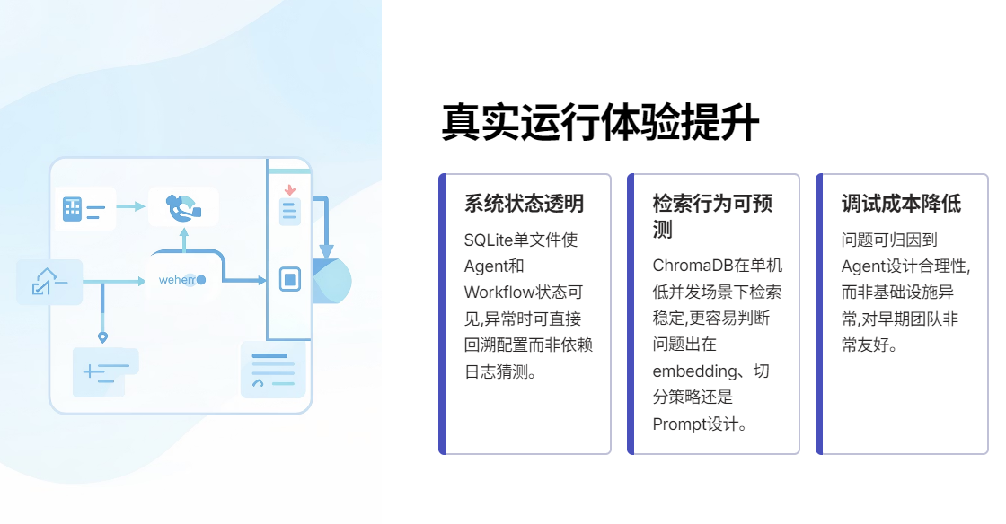 SQLite 的单文件数据库,使得 Agent 和 Workflow 的状态变得"可见"。当某次运行结果异常时,你不是只能依赖日志猜测,而是可以直接回溯配置与状态本身。