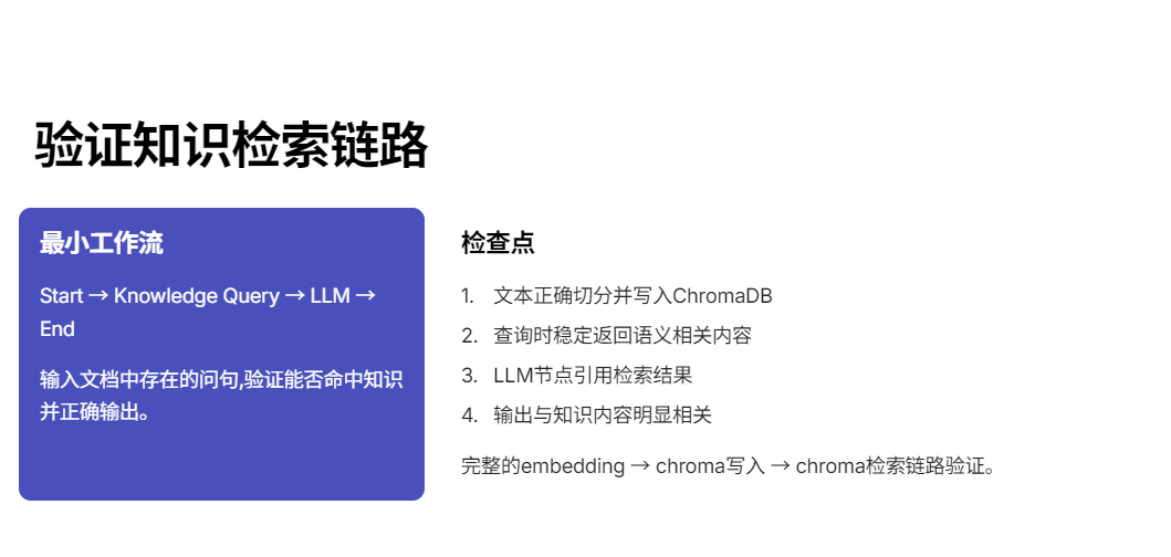 然后我们就可以检验chroma是否能用,先跑这三个检查点embedding → chroma 写入 → chroma 检索链路完整。做一个最小工作流: