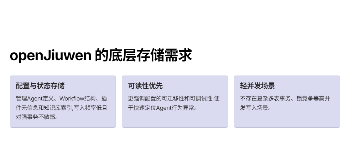 从这个角度看,openJiuwen 的数据层,本质上更接近"配置与状态存储",而不是传统意义上的业务数据库。