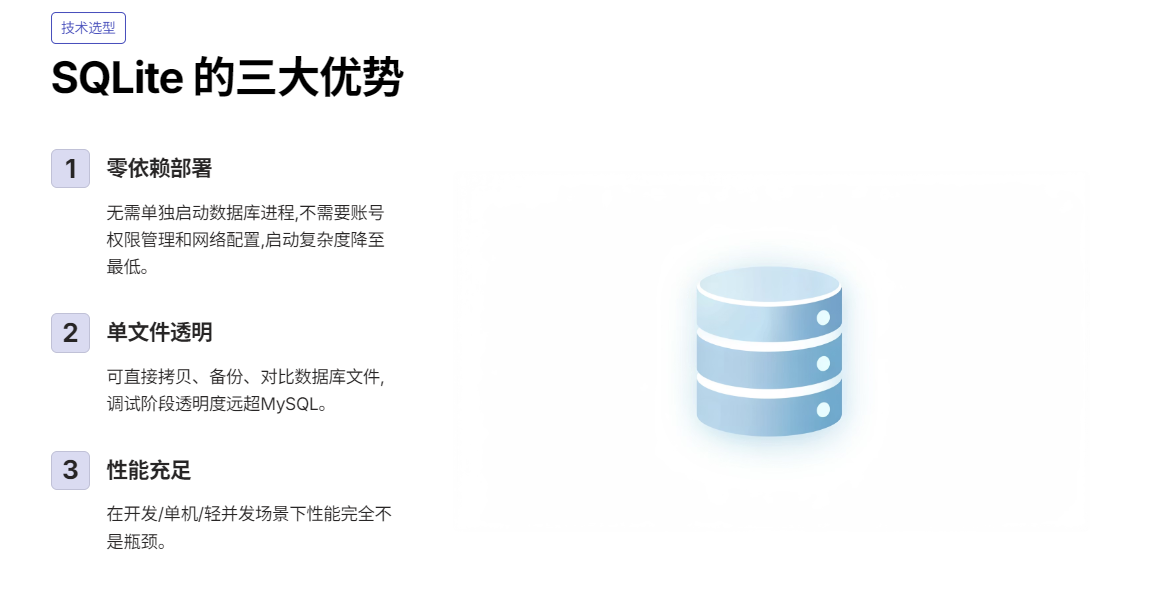 更重要的是,在 开发 / 单机 / 轻并发 场景下,SQLite 的性能完全不是瓶颈。