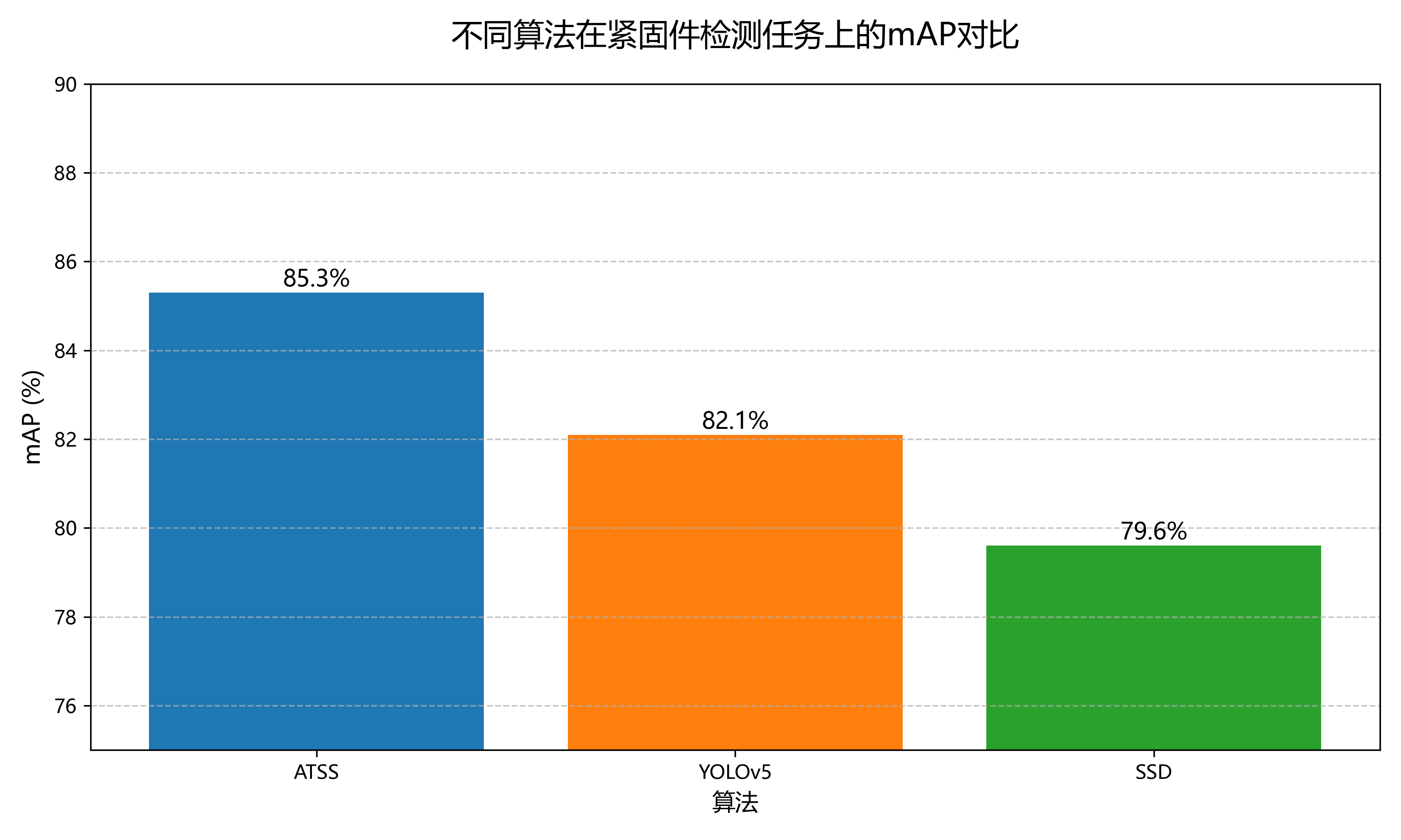 我们在紧固件数据集上进行了实验,对比了不同算法的性能。实验结果表明,基于ATSS的紧固件检测算法在mAP上达到了85.3%,比YOLOv5提高了3.2%,比SSD提高了5.7%。这表明ATSS算法在紧固件检测任务中具有明显的优势。