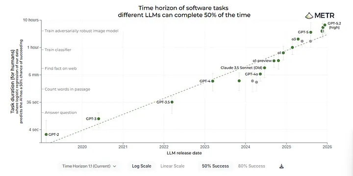 要理解这一切,你得看看这张正在疯传的图。这是一个对数坐标图,显示了模型在没有人类干预下能独立工作多久。