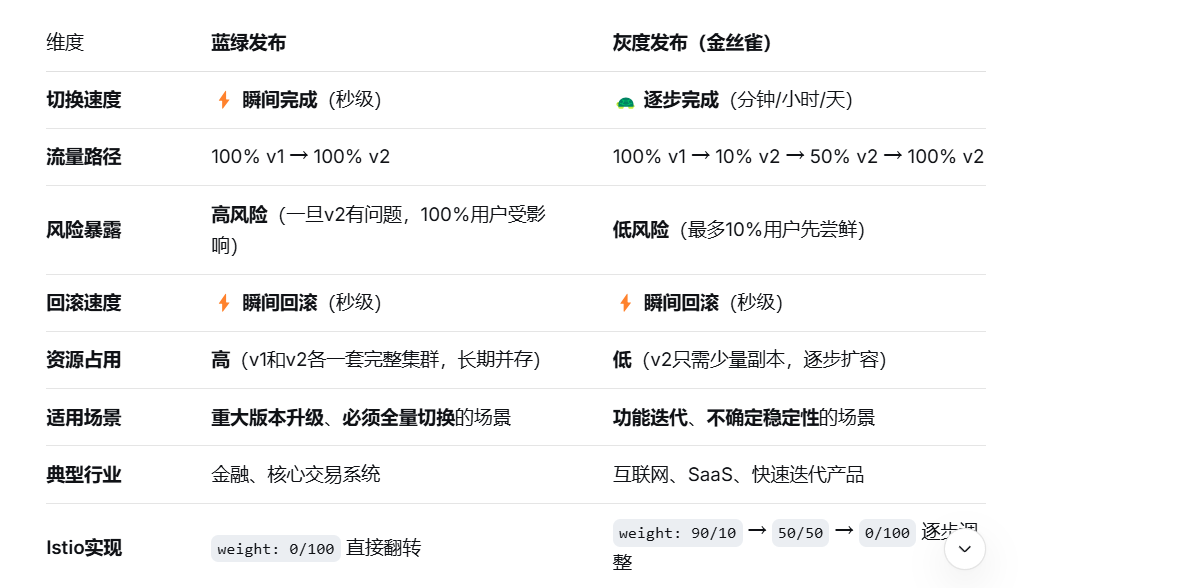 | 蓝绿发布 | 零停机、快速回滚 | VirtualService 路由规则 | 版本切换、重大升级 |