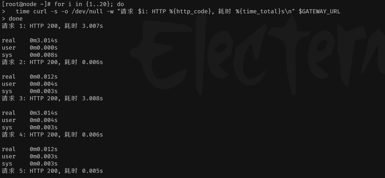for i in {1..20}; do time curl -s -o /dev/null -w "请求 $i: HTTP %{http_code}, 耗时 %{time_total}s\n" $GATEWAY_URL; done