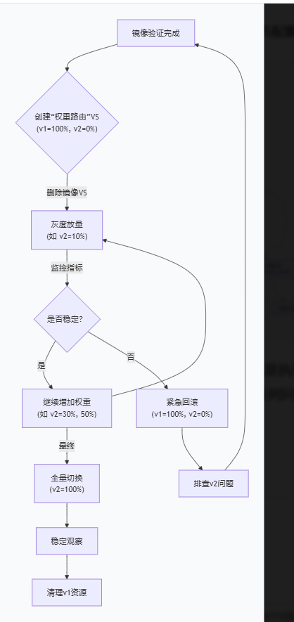 | 镜像发布 | 生产流量复制测试 | VirtualService 的 mirror 字段 | 新版本压力/稳定性测试 |