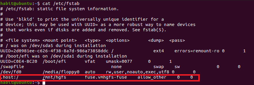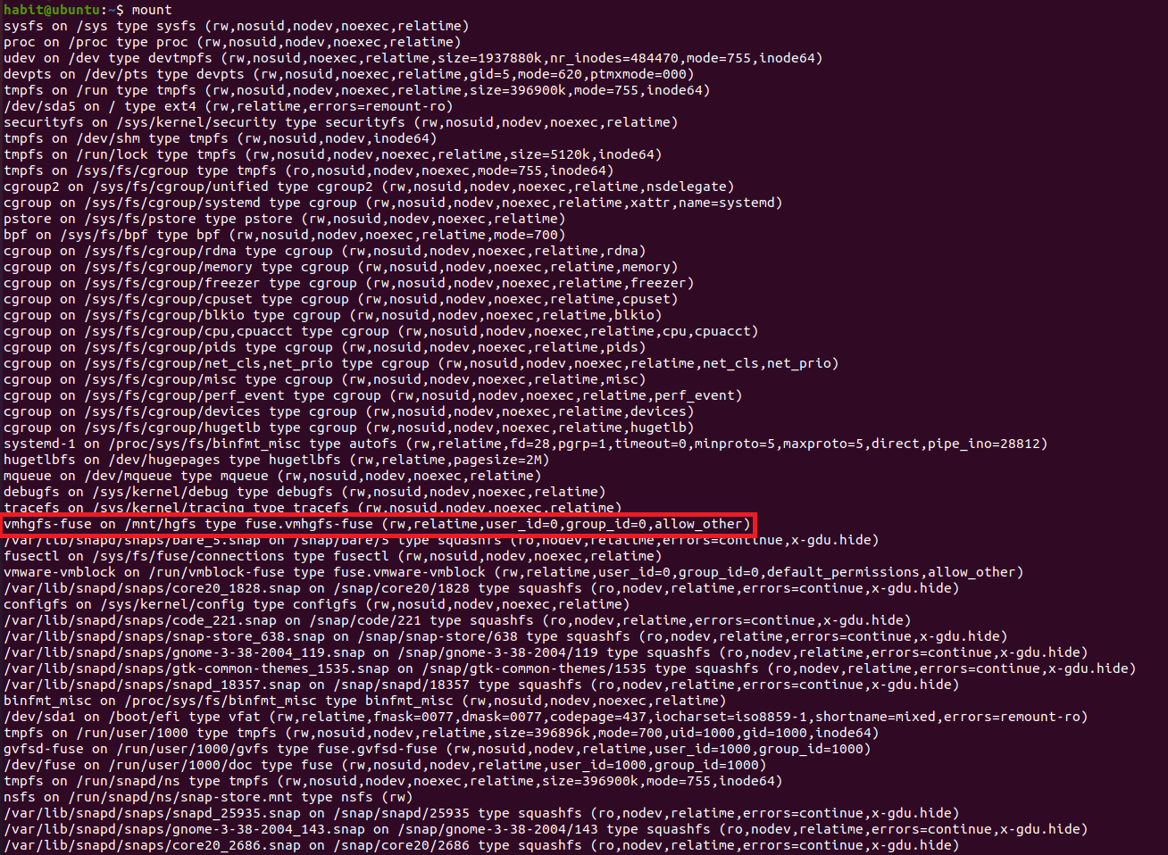 可以看到(如红色矩形框中所示),/mnt/hgfs已经自动成功自动挂载。