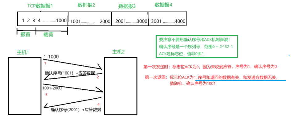 确认应答是TCP可靠性传输保障的基石,TCP数据报整体可以划分为报头+载荷两个结构,其中报头中的序号中记载着TCP数据报的载荷末尾数据的序号(无载荷时则以报头为结尾),确认应答则与报首的确认序号相关。