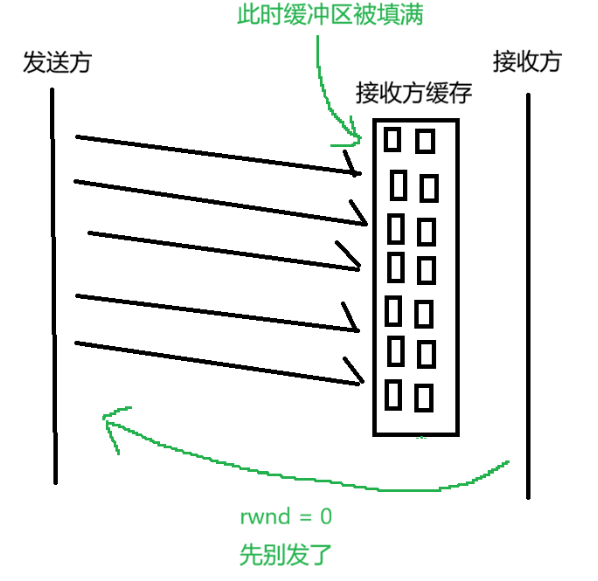 当缓冲区被填满时,剩余缓冲区大小为0,此时会rwnd = 0(Receiver Window)这个信息返回给发送方,表示"我处理不过来了,你先别发了",于是发送方就会暂时停止发送数据。