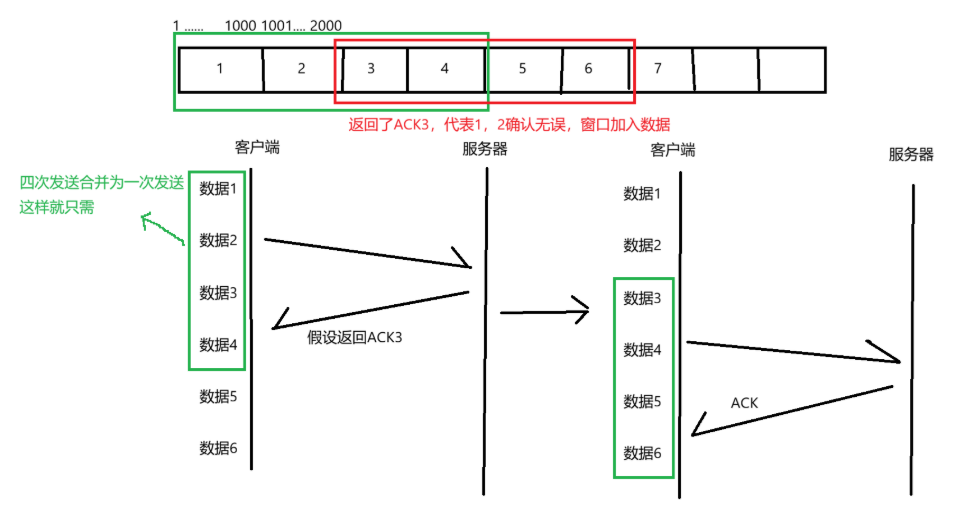 最后数据3珊珊来迟,填补空位,接受方就可以直接返回ACK6的确认应答,表示12345已全部收到。窗口就会把6之前的数据全部出窗口,实现批量入窗口,批量发送数据。