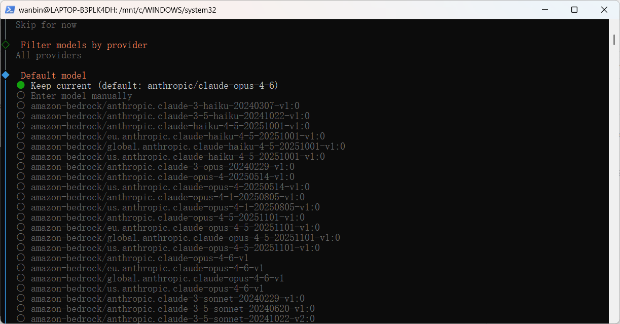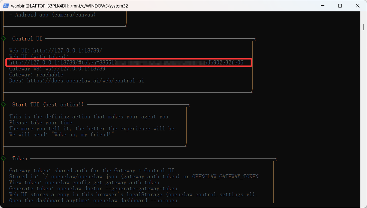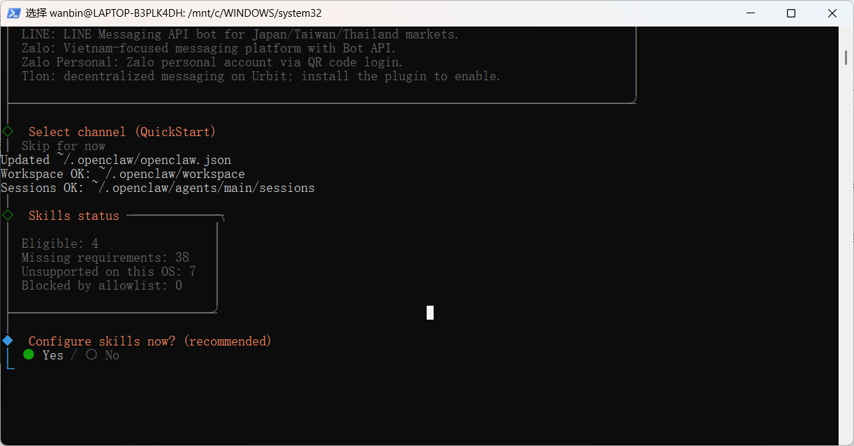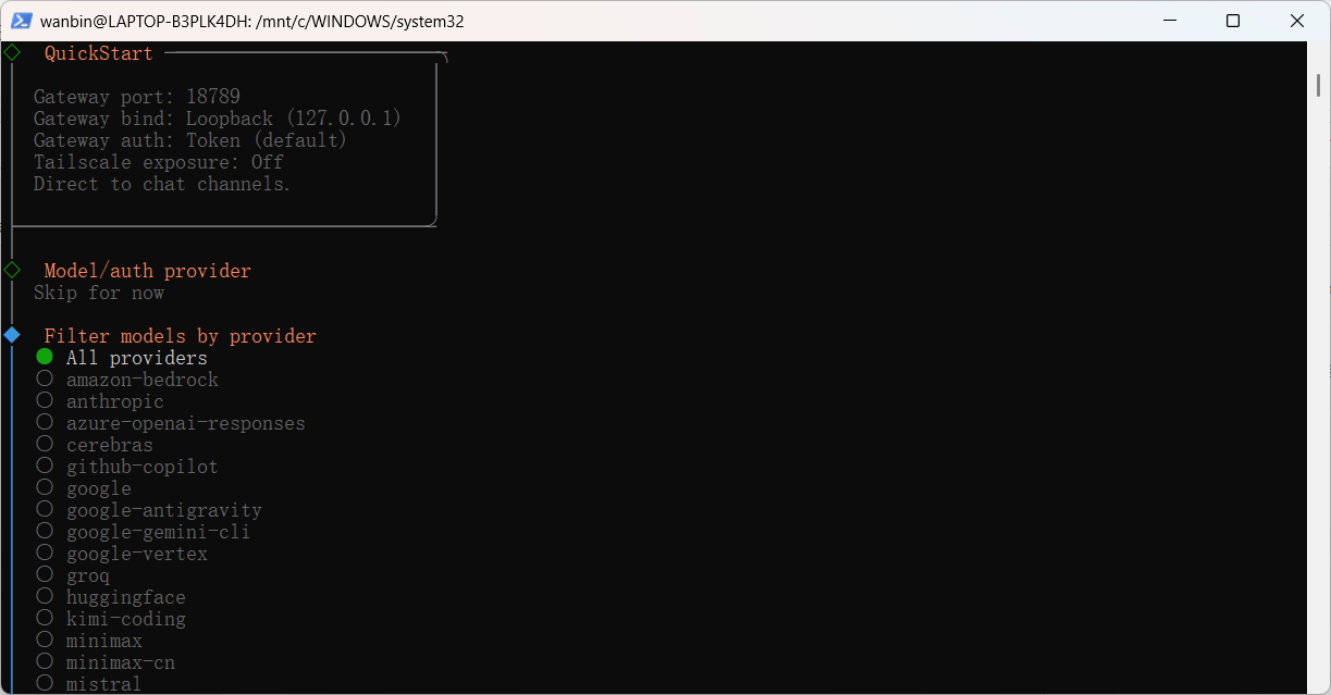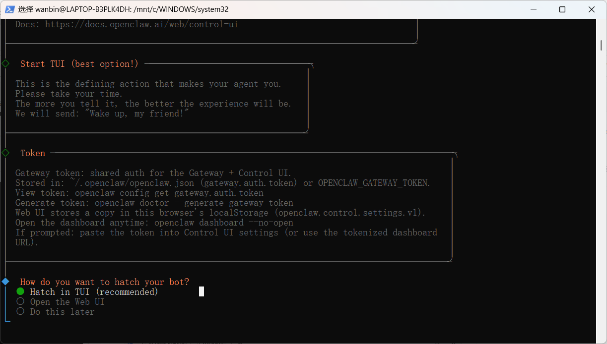 wanbin@LAPTOP-B3PLK4DH:/mnt/c/WINDOWS/system32$ curl -fsSL https://openclaw.ai/install.sh | bash