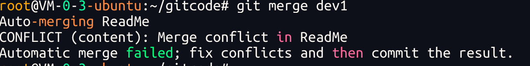 可是,在实际分⽀合并的时候,并不是想合并就能合并成功的,有时候可能会遇到代码冲突的问题.为了演示这问题,创建⼀个新的分⽀ dev1,并切换⾄⽬标分⽀,我们可以使⽤ git checkout -b dev1 ⼀步完成创建并切换的动作,示例如下: