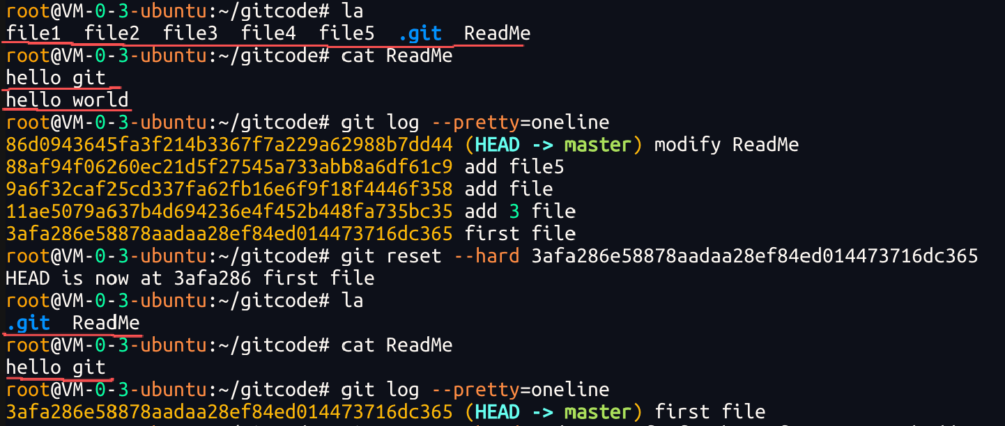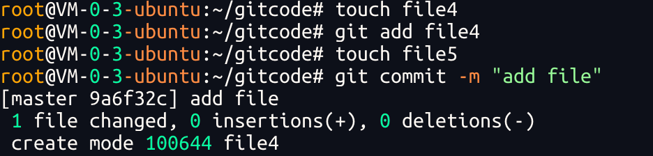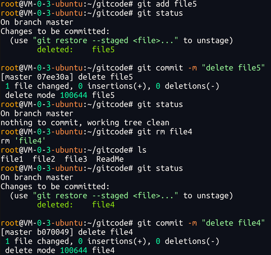 在Git中,删除也是⼀个修改操作,我们实战⼀下,如果要删除 file5 ⽂件,怎么搞呢?如果你这样做了: